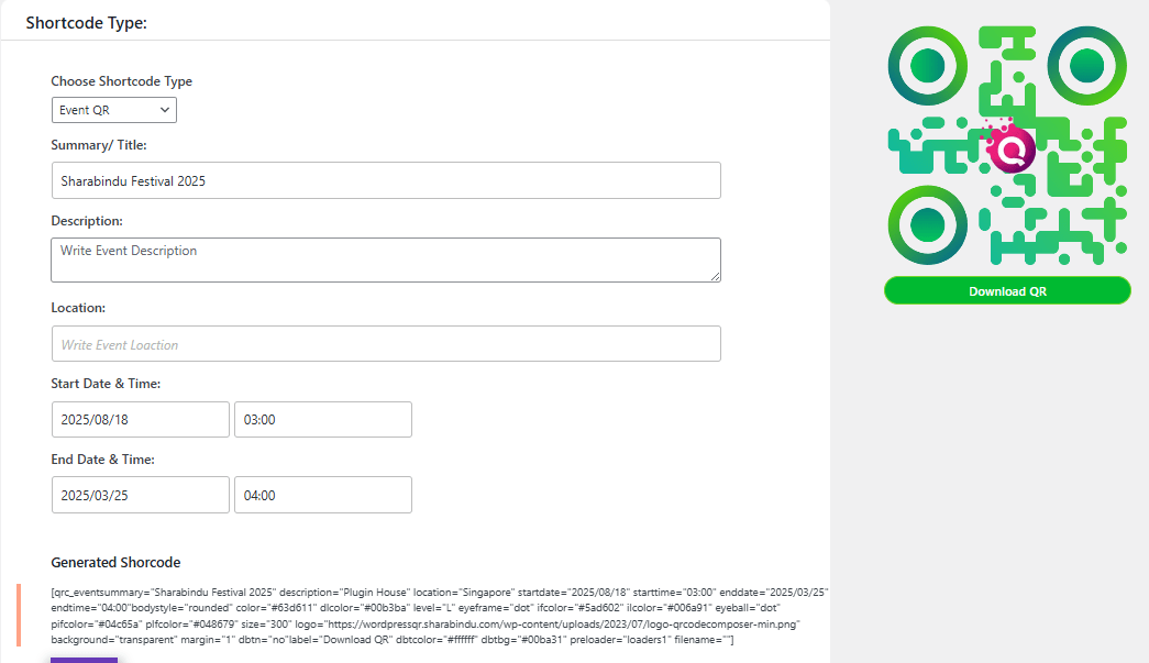 Go to the WP QR Code and then click on the Shortcode Generator. Choose Shortcode Type as Event QR, enter information, then you can redesign the QR code, add different color, different logo, and then save the Shortcode.
