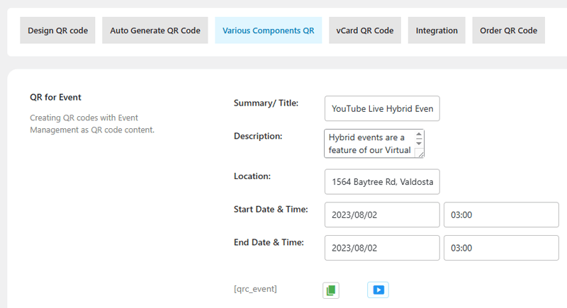 Go to the plugin settings page and then click on the Various Components QR tab. You will find the QR for the Event field here, fill up the event information, and copy the shortcode