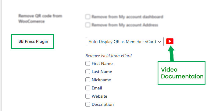 - Auto Display QR as Member vCard: When you select this option, the vCard QR code will automatically be displayed on the bbpress member page and the content of the QR code will be the member profile information. When you select the option, you will see some checkboxes. If you click on a checkbox, then that information will be removed from the vCard Qr code, so mark the checkbox and save the information you want to hide.